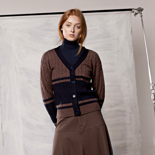 Varsity Cardigan IN: Navy/Brown