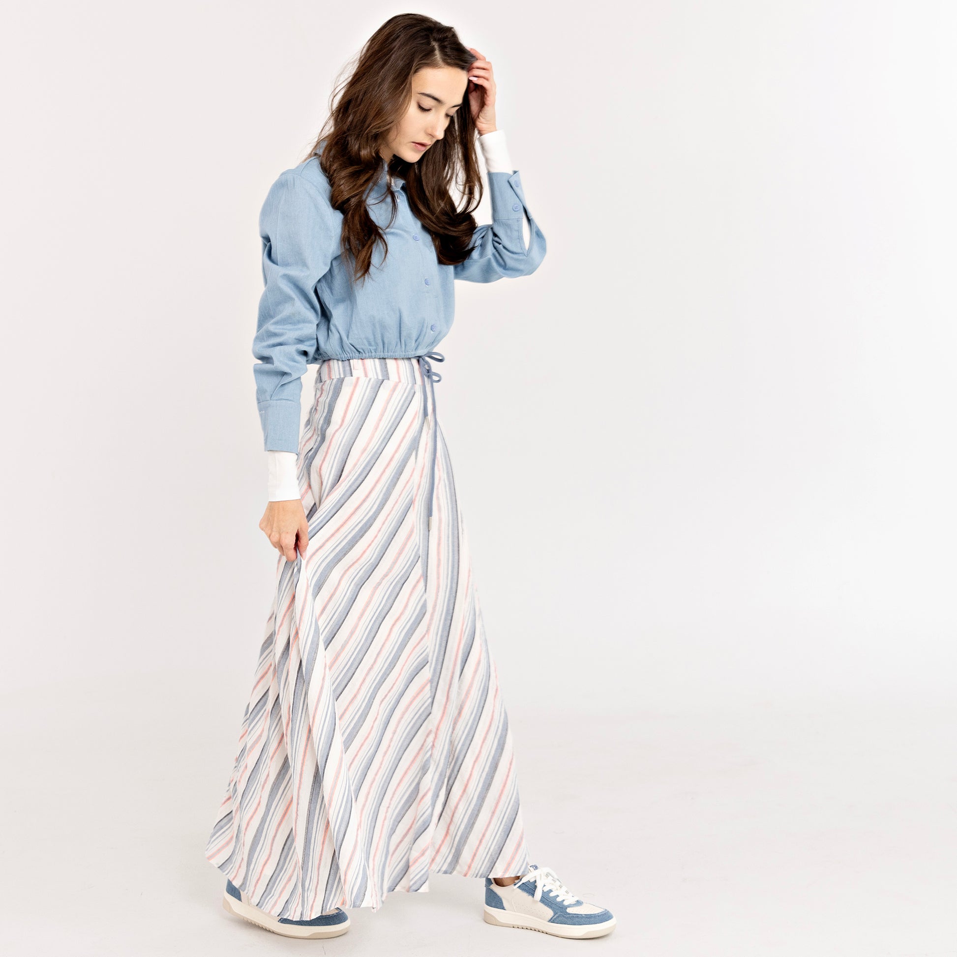 The A-Line Skirt is a fusion of function and fun. Featuring flowy material, and rope waist tie, this neutral color skirt is a must have.