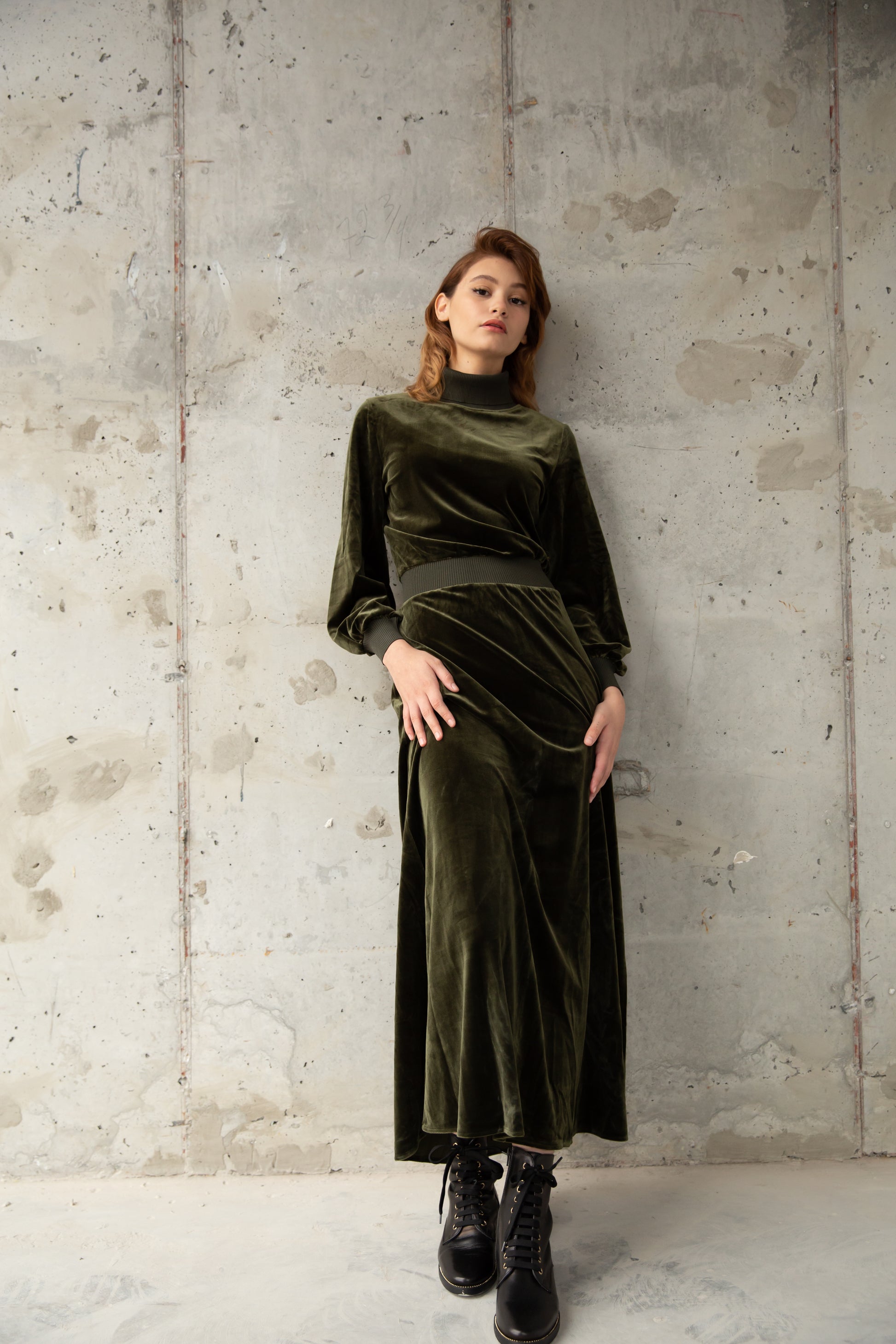 The Winter Winner Dress is that easy pull-on maxi that never gets old. Cut from a flowing and light velour. Features a ribbed waist and mock neck.