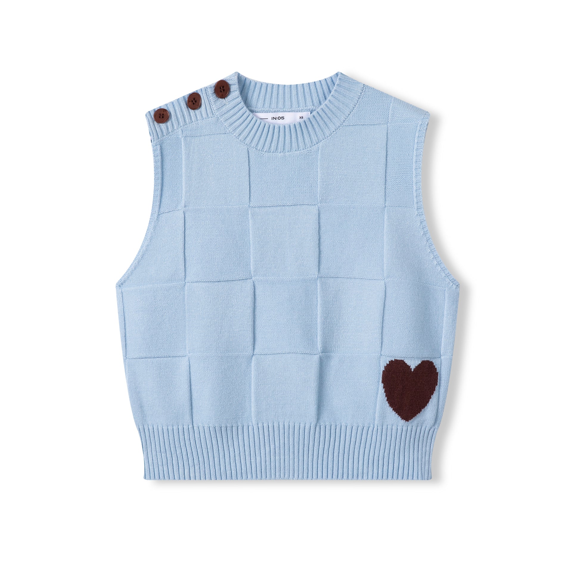 This heart vest features distinctive button detailing, creating a charming yet refined look. Designed to complement a light blue modal mockneck and pair seamlessly with a brown skirt, it offers a harmonious blend of textures and colors for a polished, coordinated outfit.