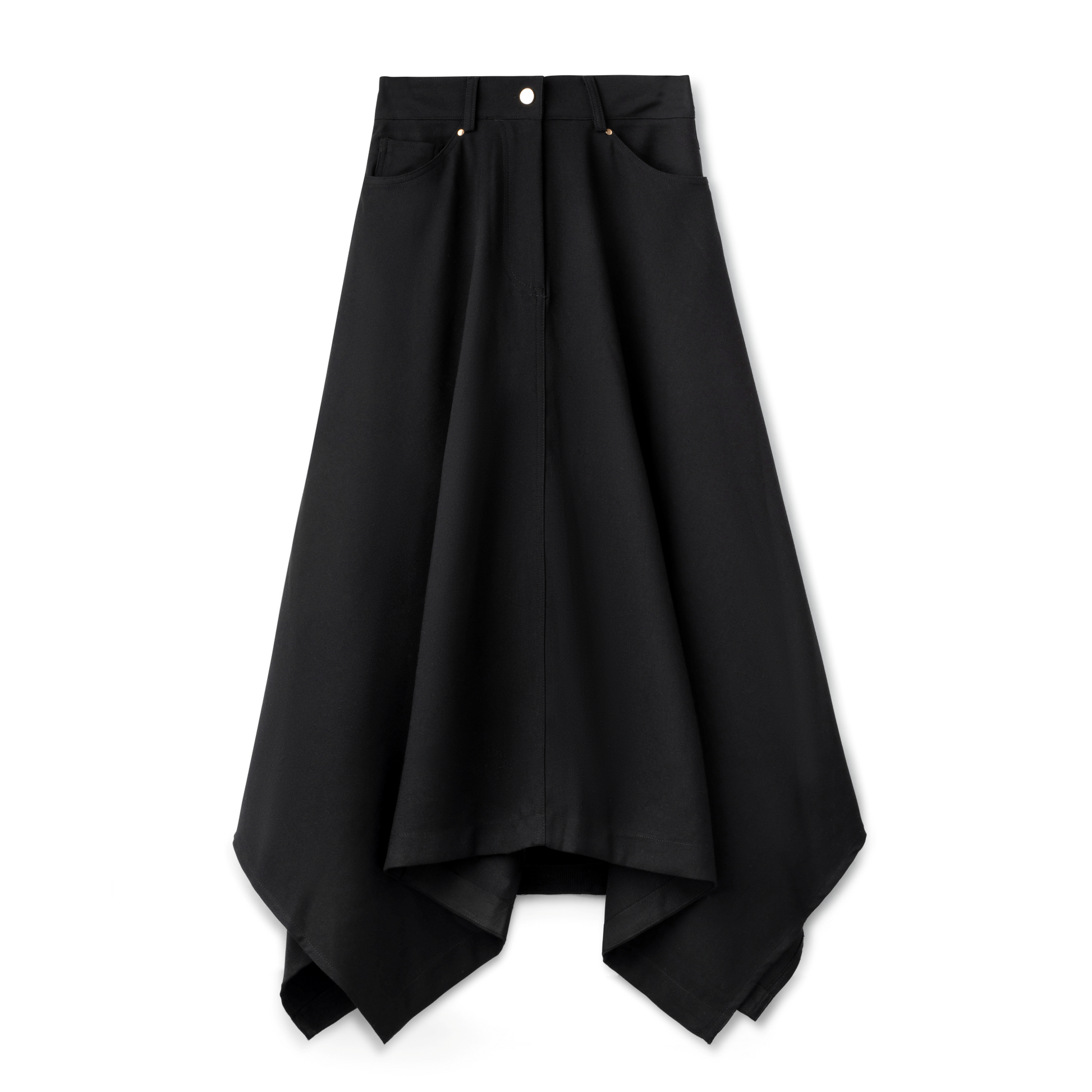 The Kercheif Skirt is our most casual silhouette. Cut from a rich, textured fabric the asymmetrical fringed hem, pocket and zipper detail give the typical skirt an unexpected twist.