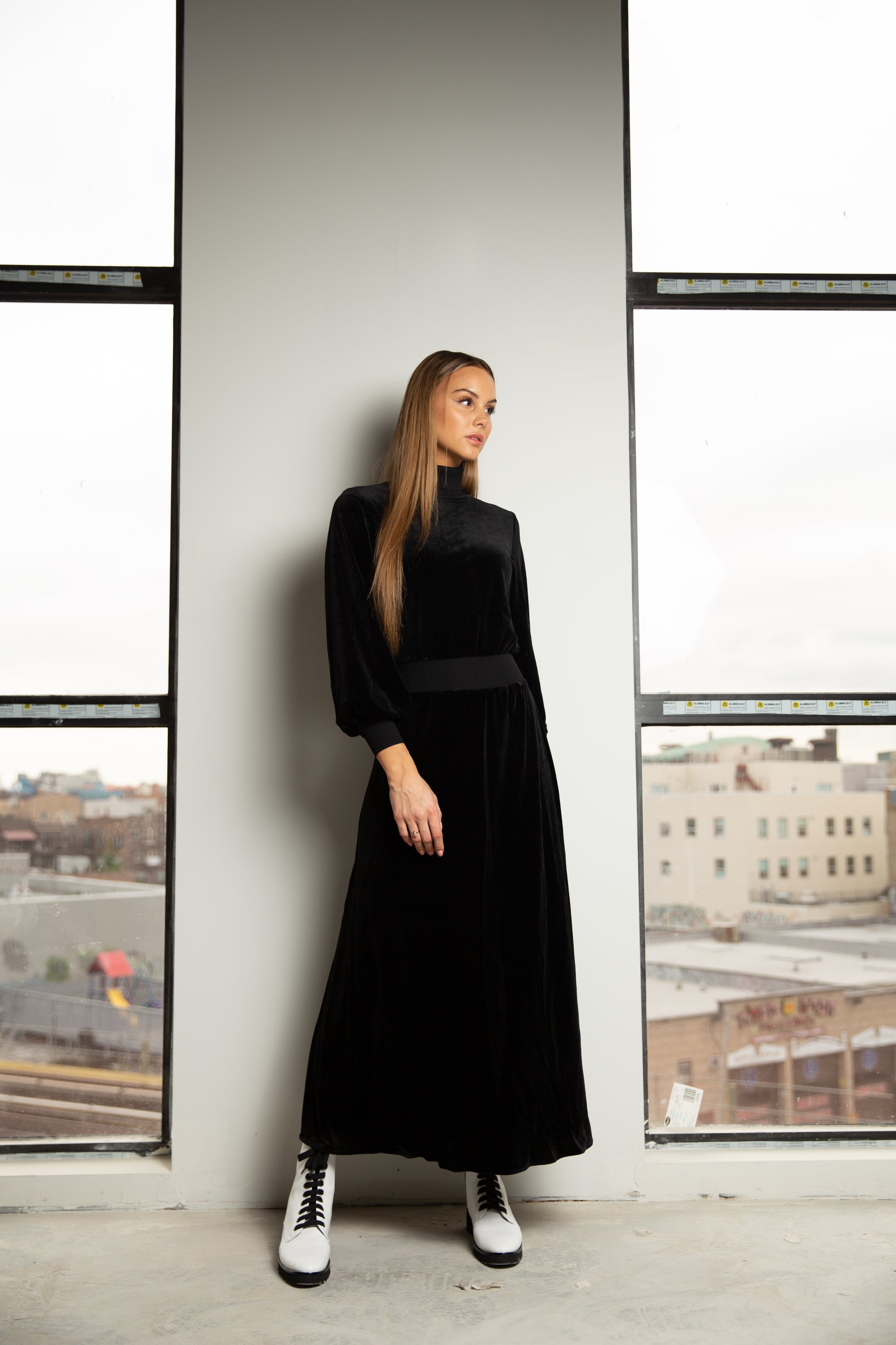 The Winter Winner Dress is that easy pull-on maxi that never gets old. Cut from a flowing and light velour. Features a ribbed waist and mock neck.