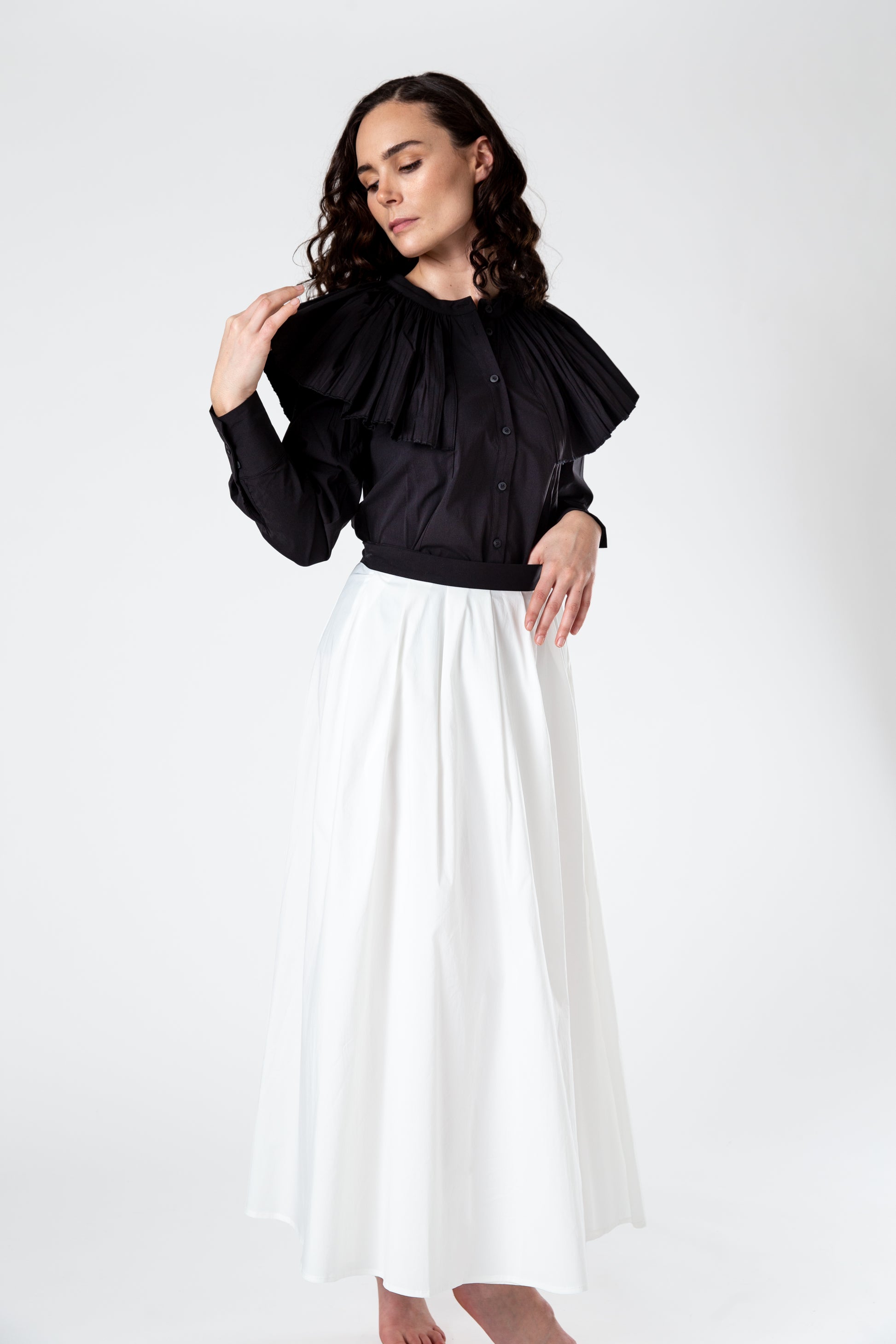 The Waistband Skirt features voluminous fine cotton, a contrasting waistband with delicate matte button details.